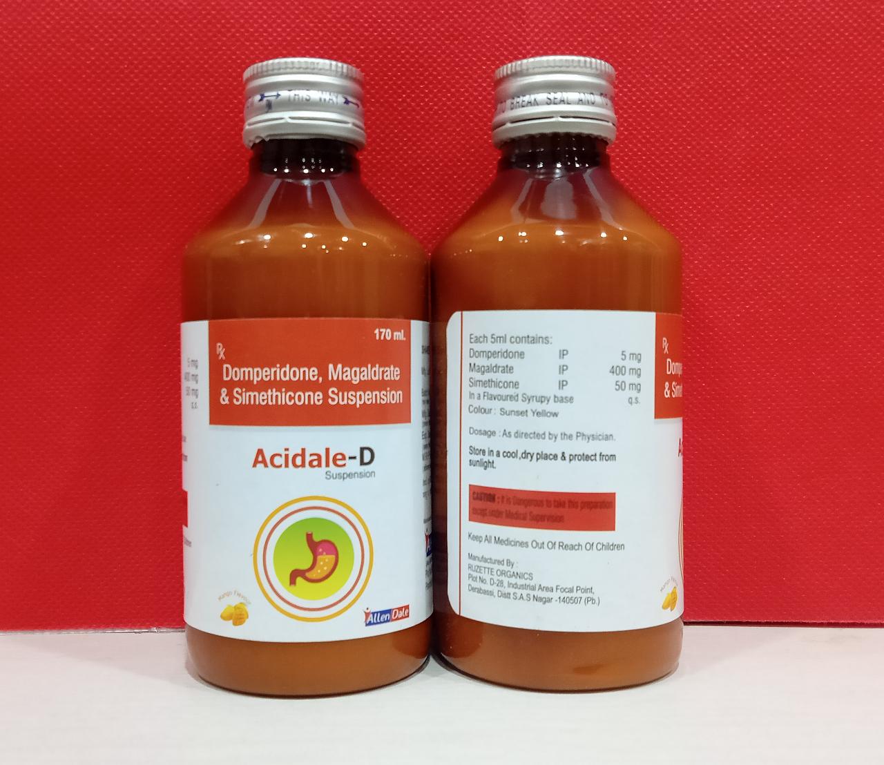 Acidale-D Suspension is a combination of Domperidone, Magaldrate, and Simethicone designed to provide fast and effective relief from acidity, bloating, gas, and related discomfort. It helps neutralize excess stomach acid, improves gastric motility, and relieves symptoms associated with indigestion and reflux.
